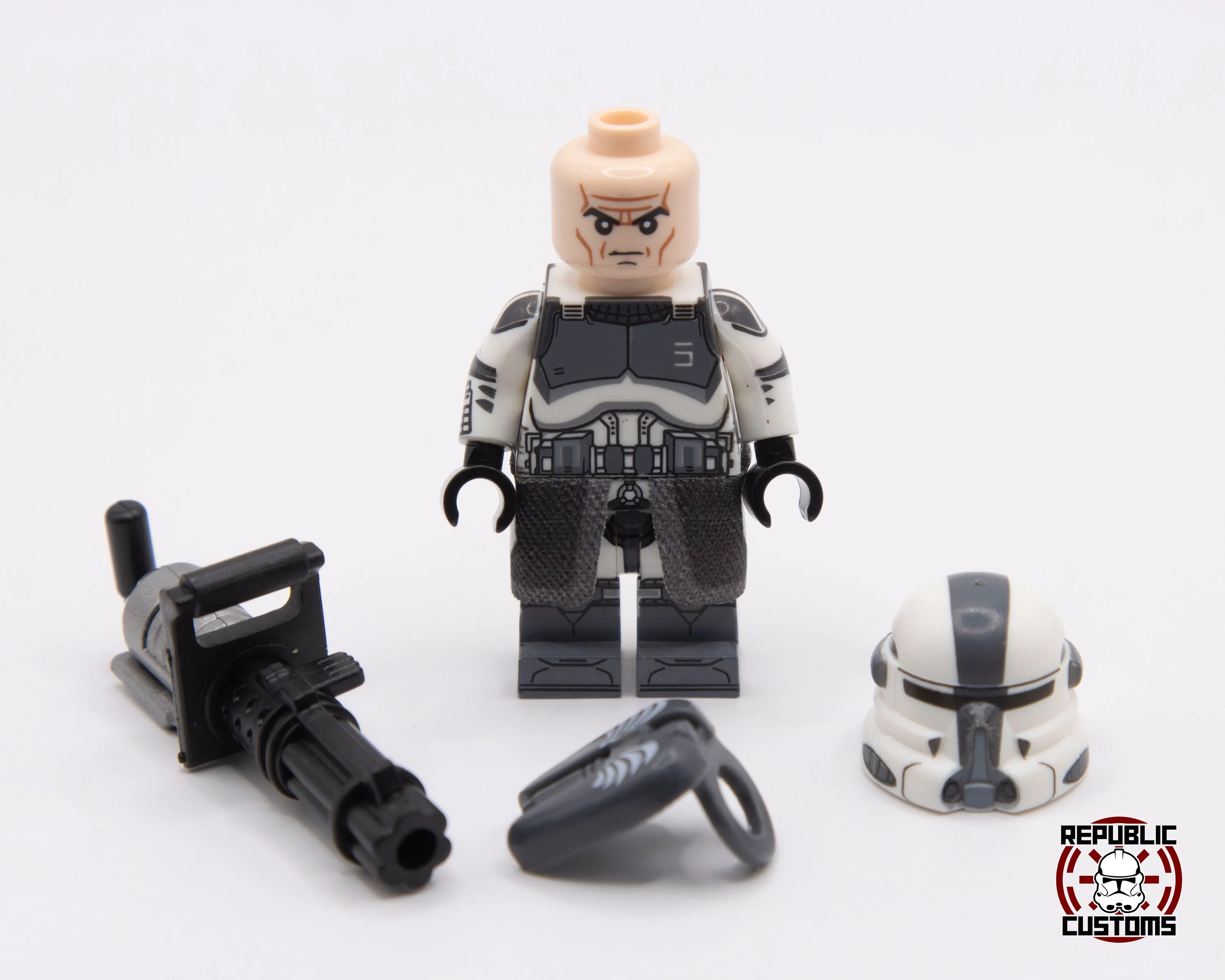 Heavy airborne clone from Plo Koon's 104th Wolfpack. Made with high-quality 360 pad printing to be as screen-accurate as possible. Comes with clone back armor, Wolfpack fabric kama, and a custom molded Z-6 rotary blaster.
