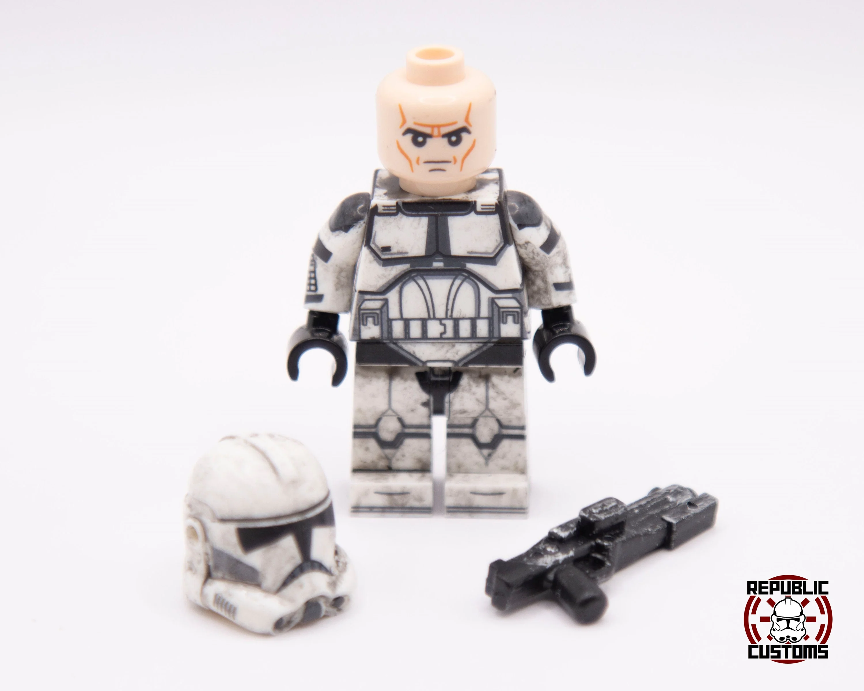 Worn and battle-damaged clone trooper. Hand painted damage over high-quality 360 pad printing. Comes with a custom molded and hand-painted DC-15S.